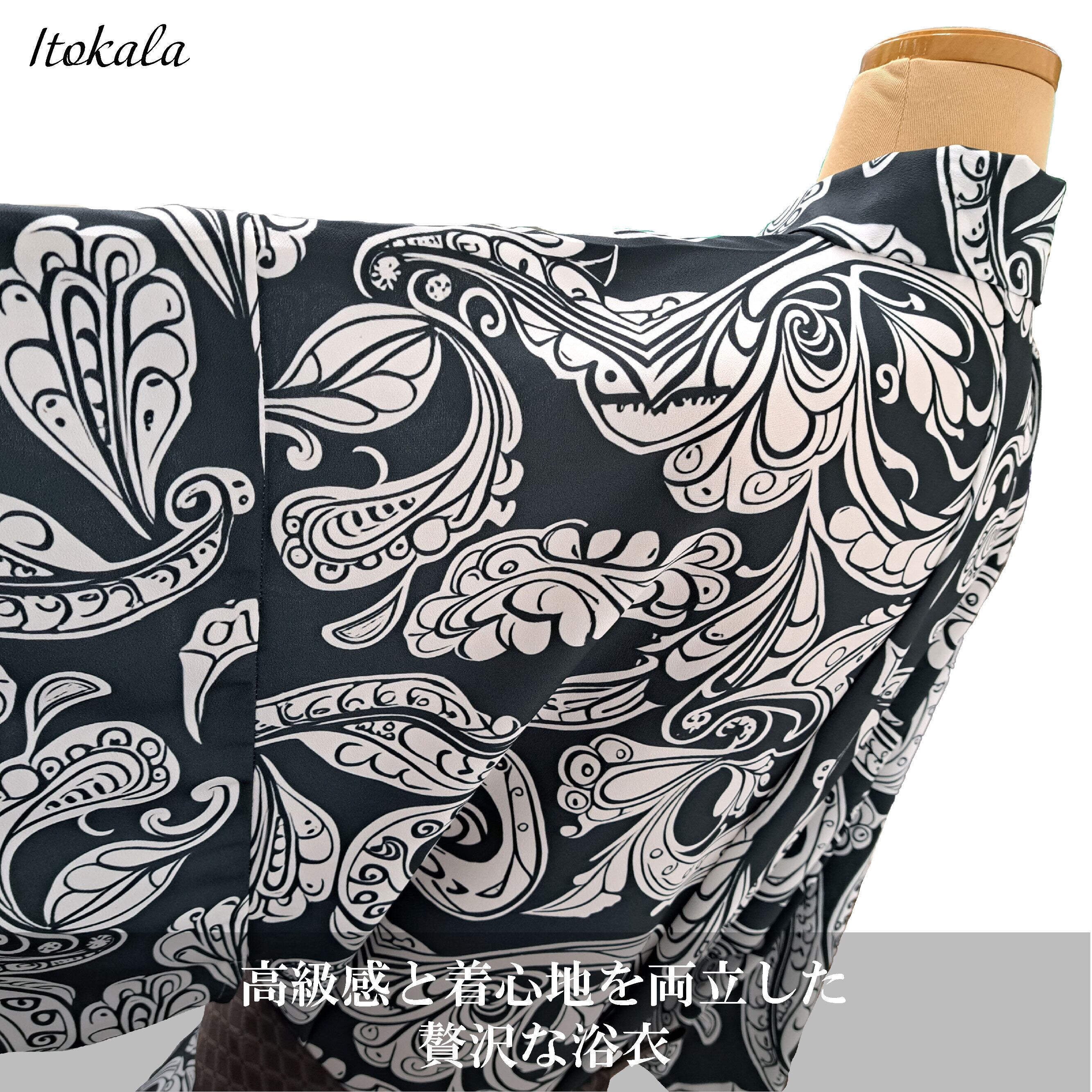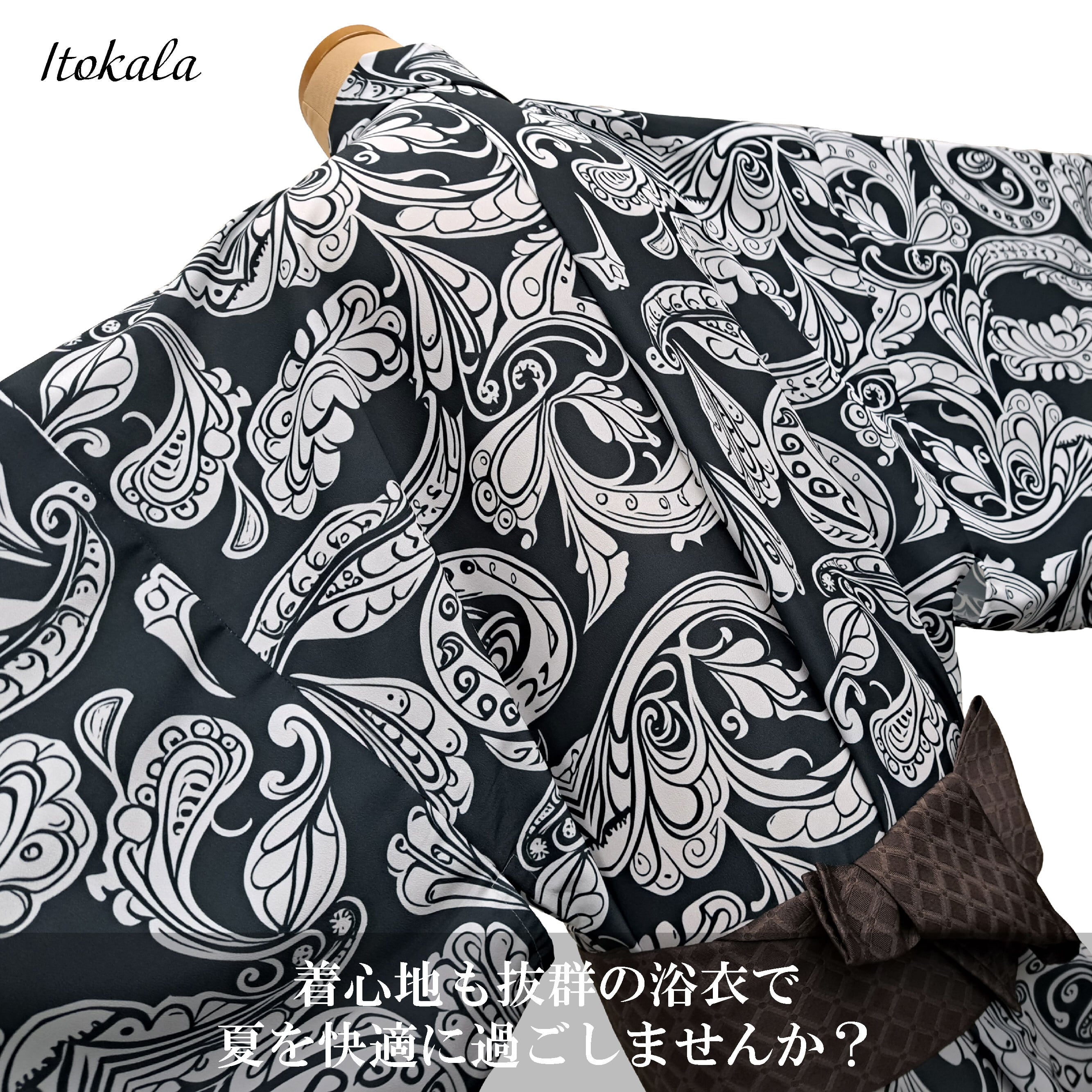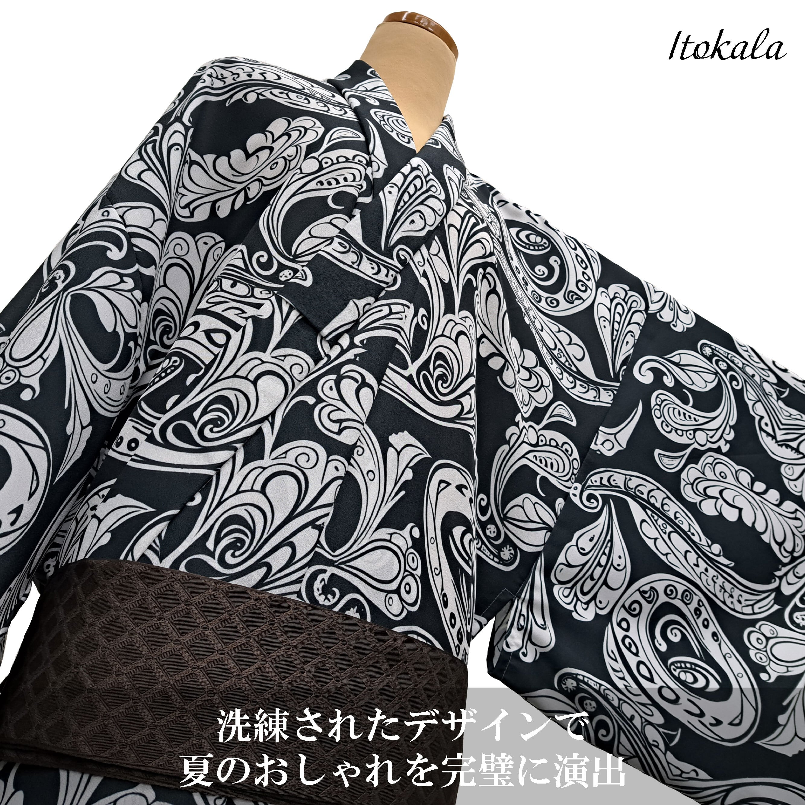 Itokala夏着物は、夏にぴったりの涼しく上品な着物です。ポリエステル製なので、お手入れが簡単で、浴衣としても使えます。織りにこだわったちりめん生地を使用し、【帯】は小杉織物が選ぶ最高に清涼感のある夏にぴったりの【帯】を使用しています。